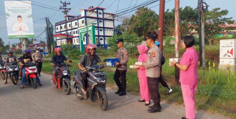 Menjelang waktu berbuka puasa, personel Polsek Sekadau Hilir bersama Bhayangkari turun langsung ke Jalan Merdeka Selatan, Desa Sungai Ringin, Kecamatan Sekadau Hilir, Kabupaten Sekadau, Senin (2/3/2026). Mereka membagikan paket takjil kepada para pengendara yang melintas.